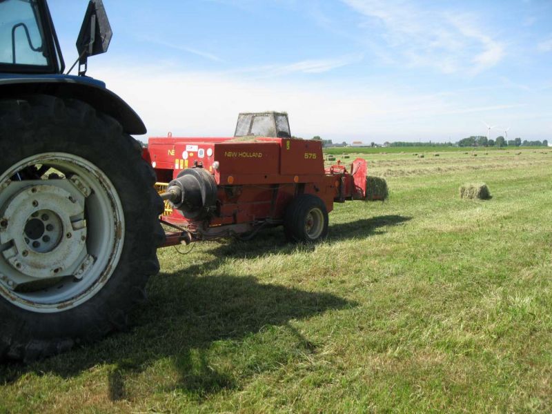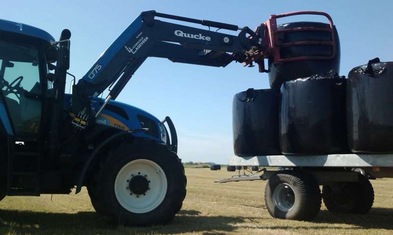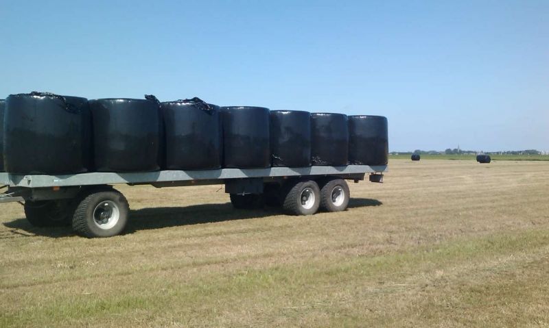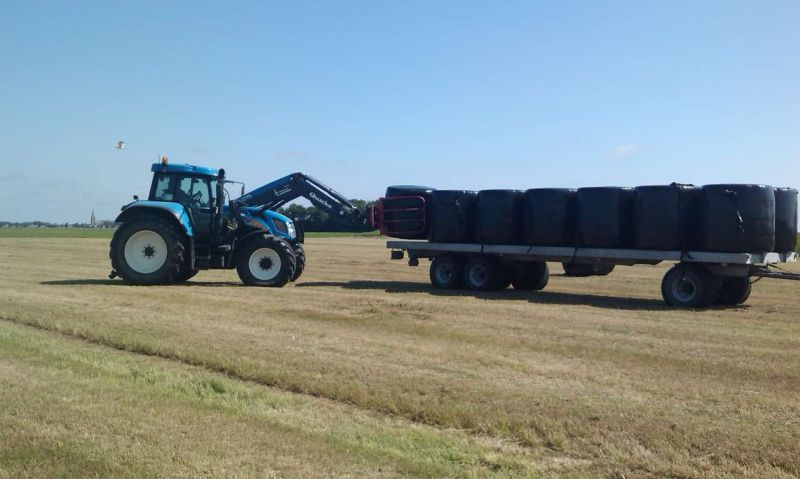 De pakken/balen ruimen we op met een New Holland 7520 (vario), die voorzien is van een Alo Quicke voorlader Q75 en 9 meter lange transportwagen met tandem-as en brede banden.